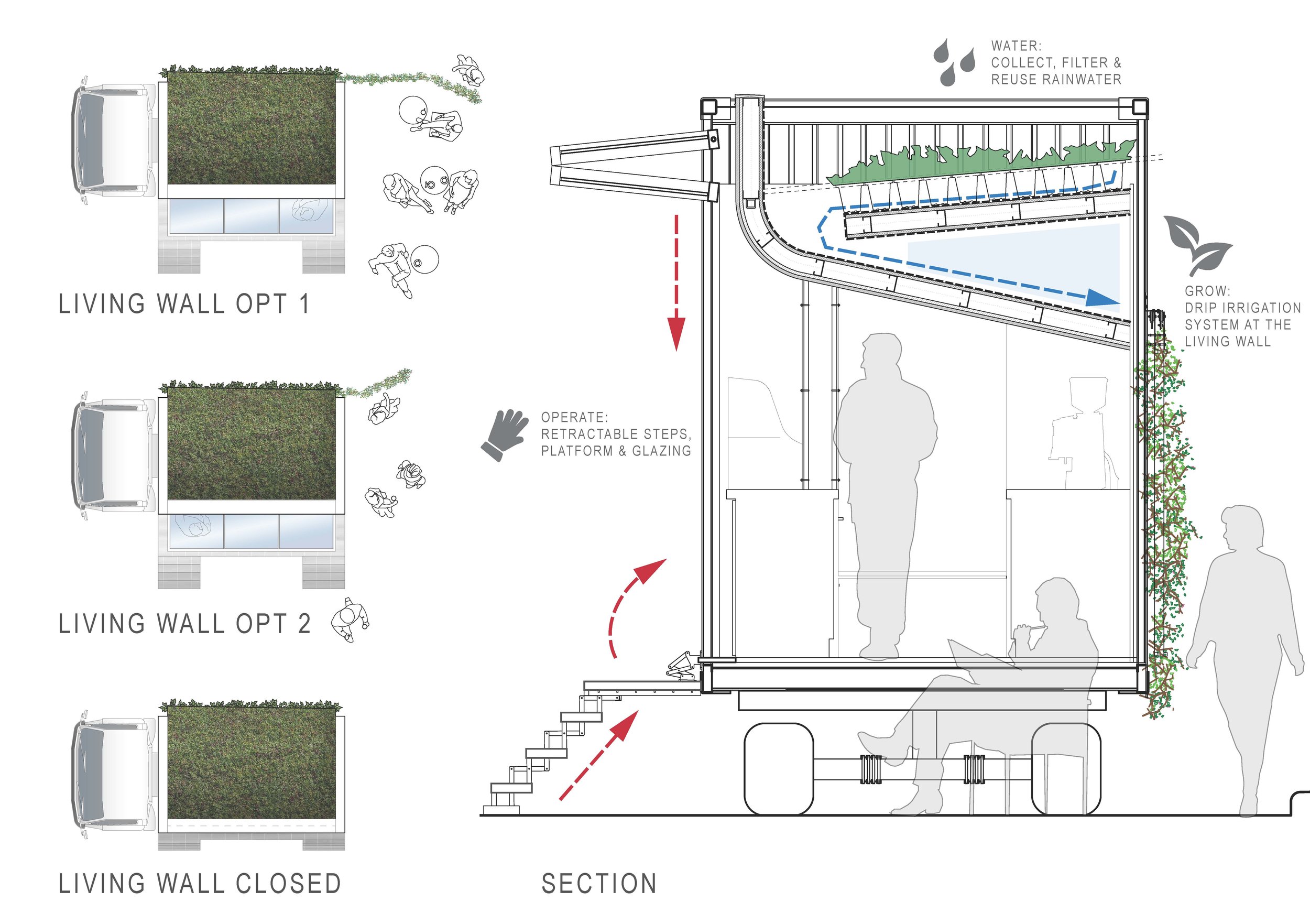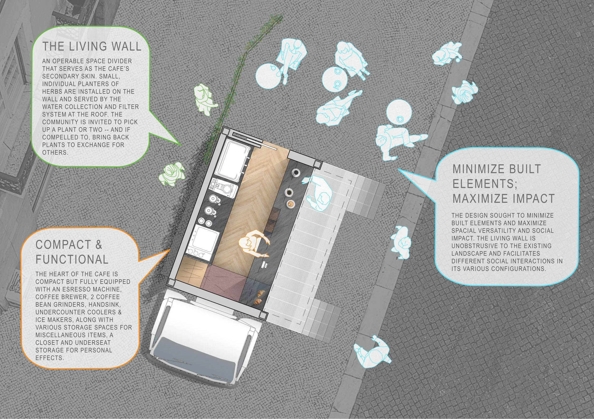 We came to the conclusion that the design should be an icon of the people. Considering the context of contemporary European cities, the design should not take away from the beautiful existing urban fabric. Such as an iconic plaza, the cafe shall be recognized not by its form but by the social interactions it encourages. An element of greenery was introduced to complement the conversation of coffee.